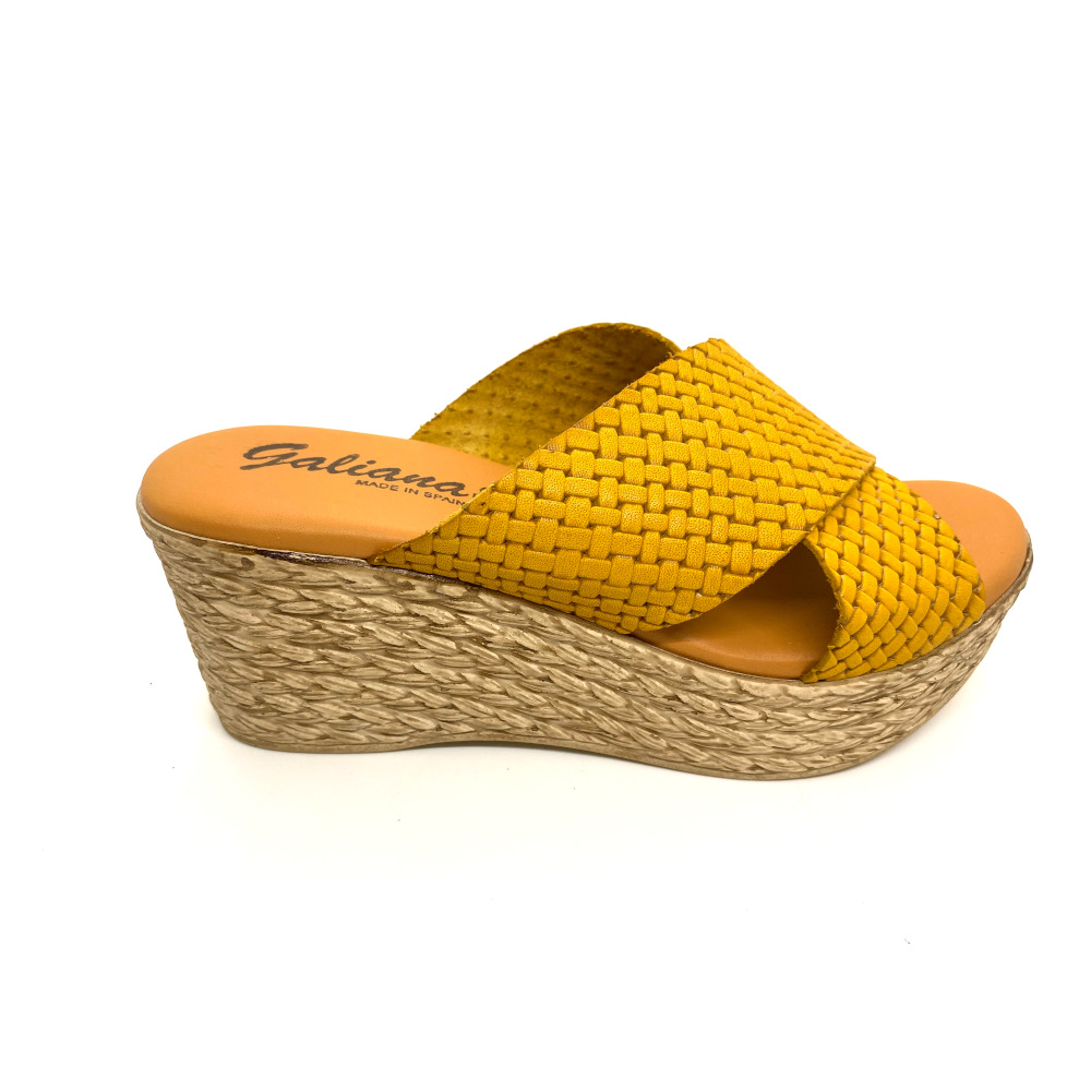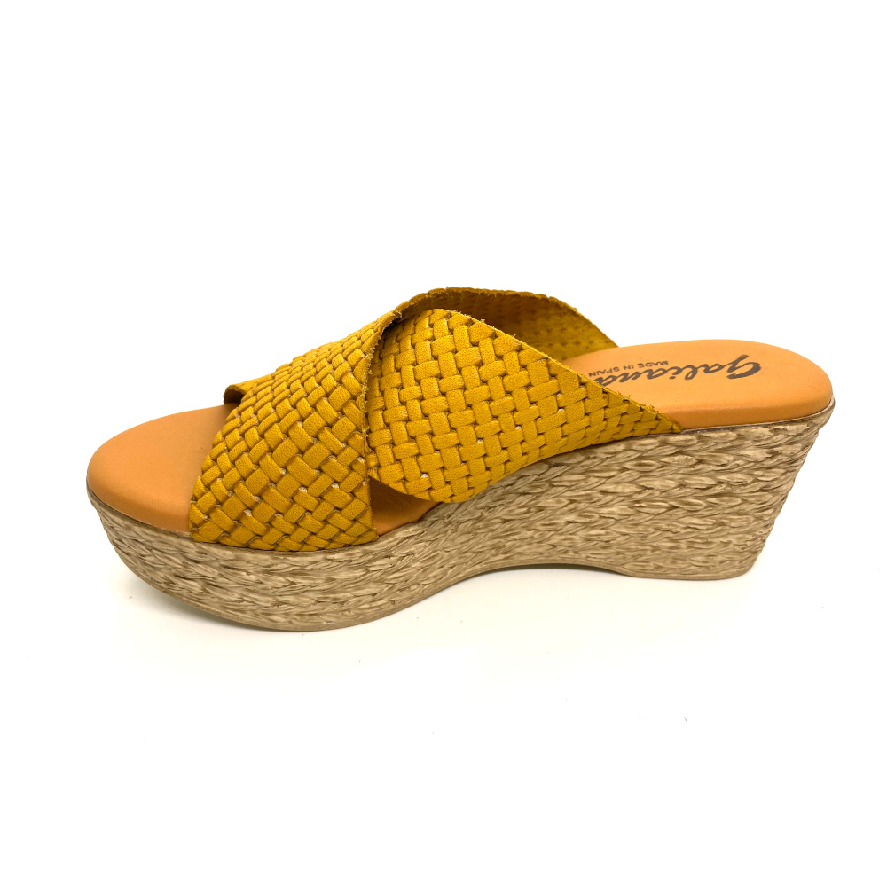 Cuña vaquetilla con grabado en color mostaza y planta de gel que hacen de este modelo tener un máximo confort además de una elegancia natural.