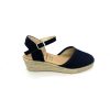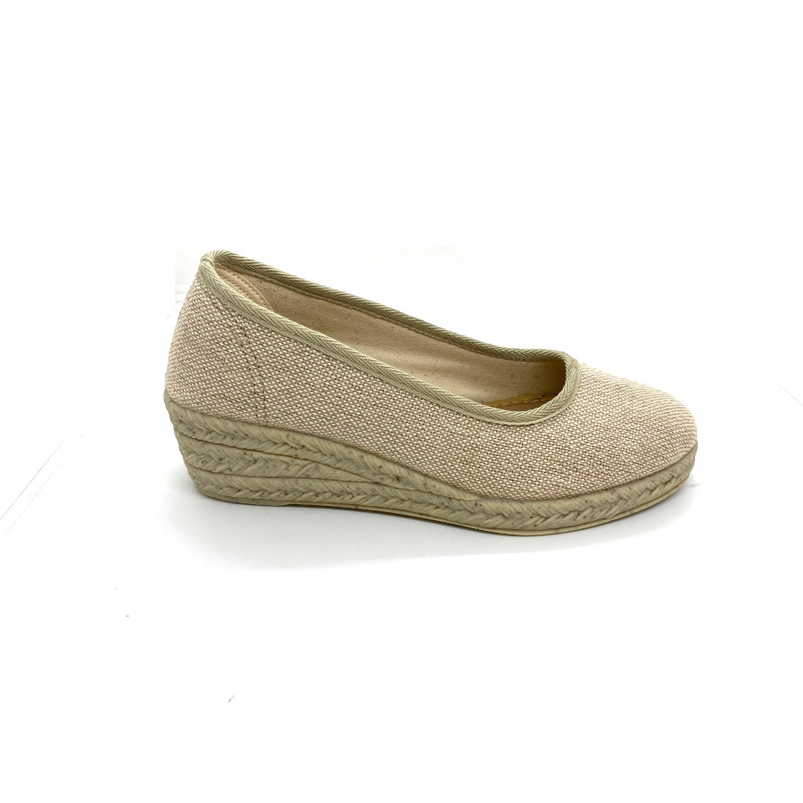 Zapatilla tipo salón fabricada en material textil con suela imitando al cáñamo y ajuste de pulserilla.