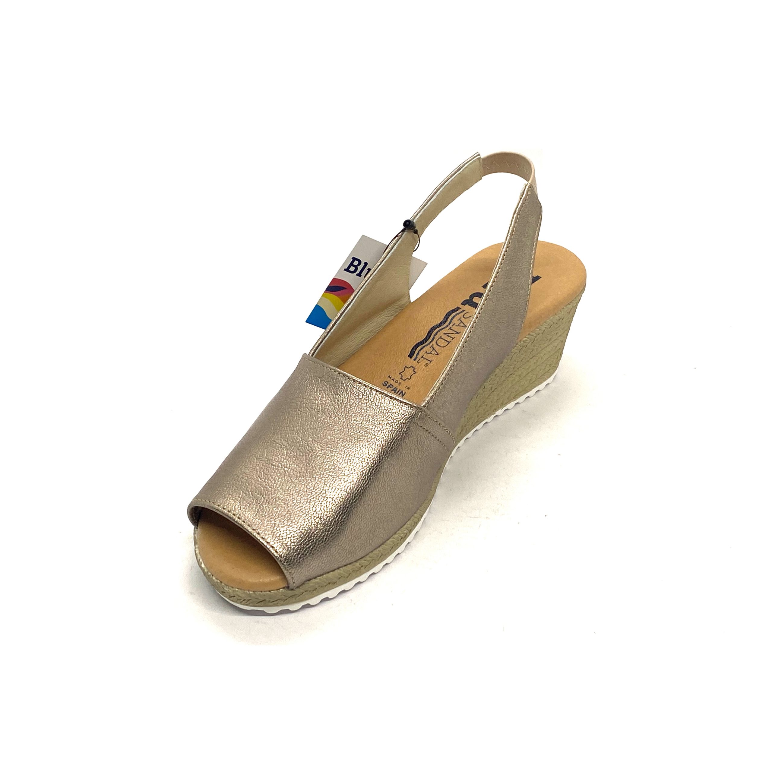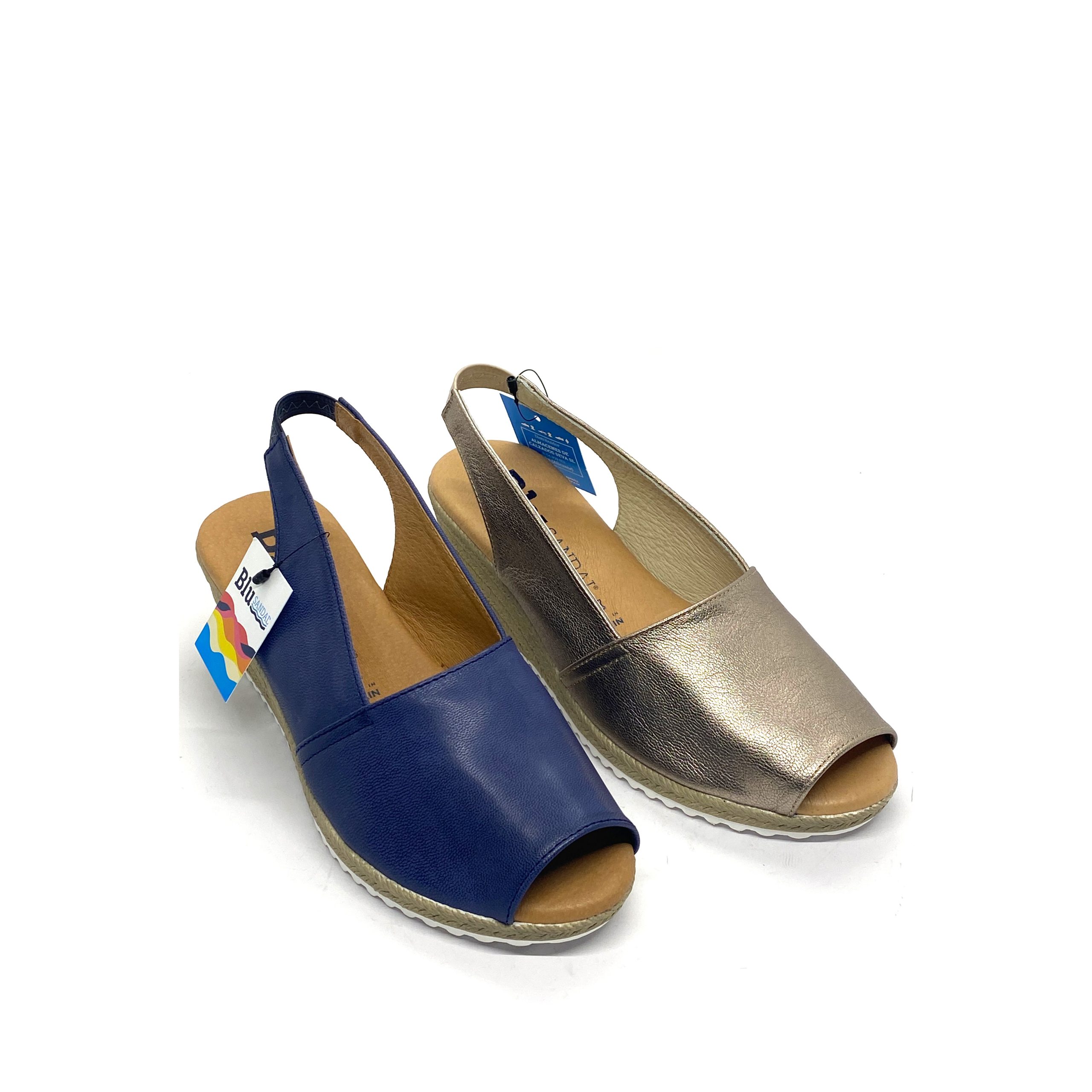 Sandalia con cuña y elástico para señora de la marca Blusandal en colores Platino y Azul marino.