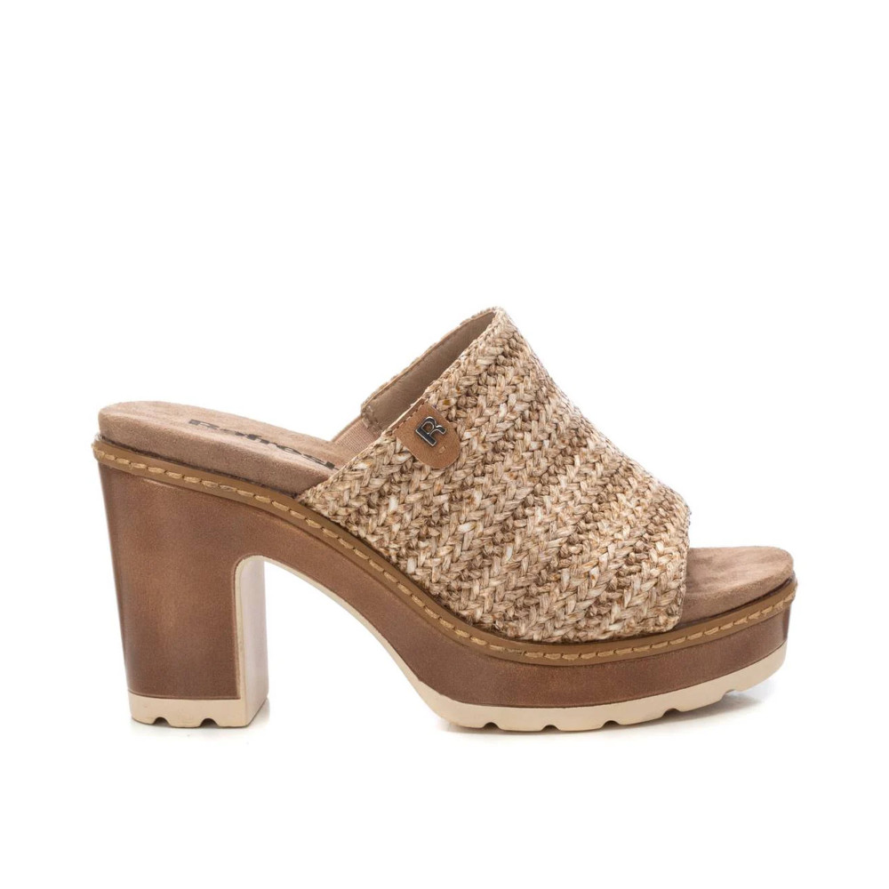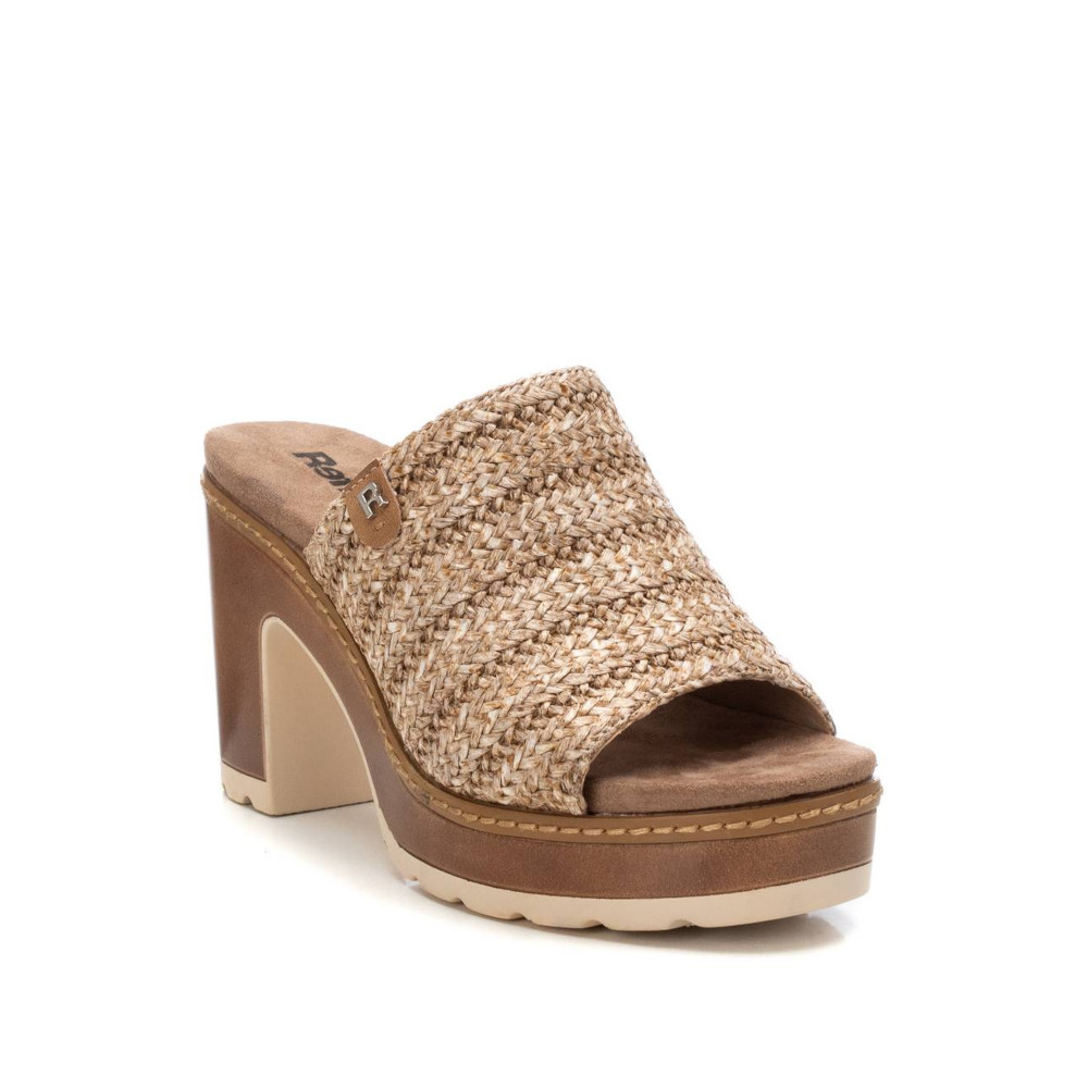 Sandalia de mujer, de la marca Refresh. Fabricada en material textil tipo rafia. Modelo estilo mule con tacón ancho de 10 cm y plataforma delantera. Suela antideslizante. Este modelo ha obtenido el certificado vegano por la organización mundial PETA (Organización de los derechos de los animales).