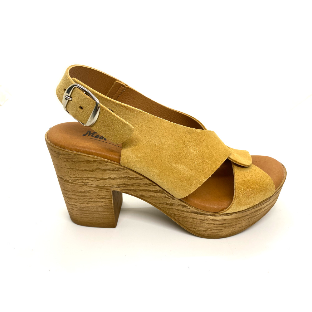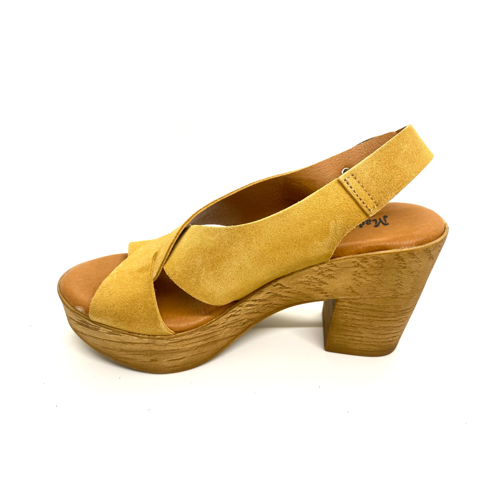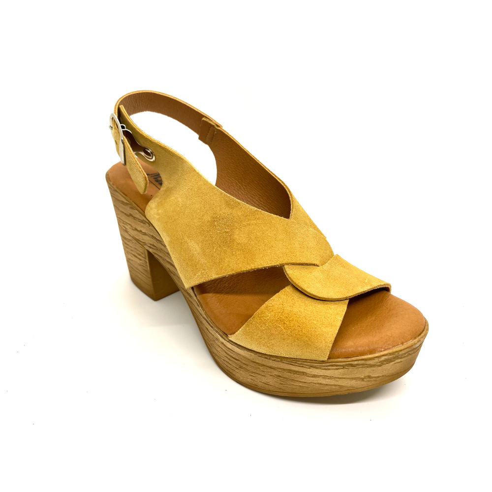 Sandalia tacón plataforma en piel serraje color miel con tira ancha entrecruzada que hacen un diseño inigualable. Planda de gel para máximo confort.