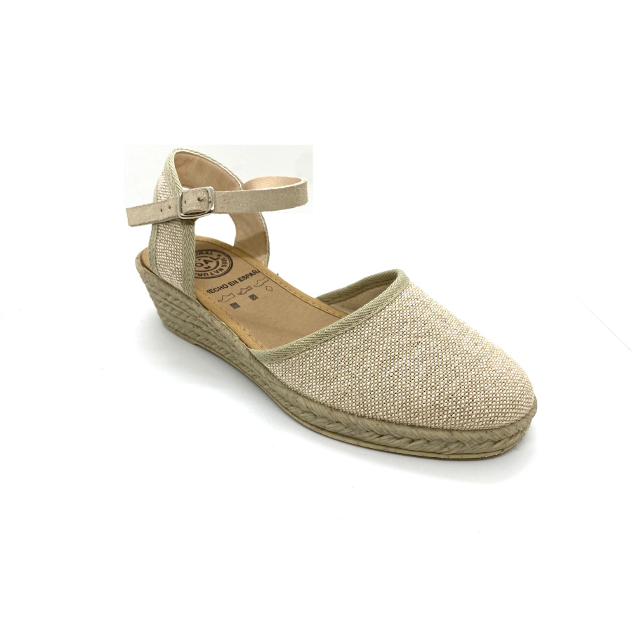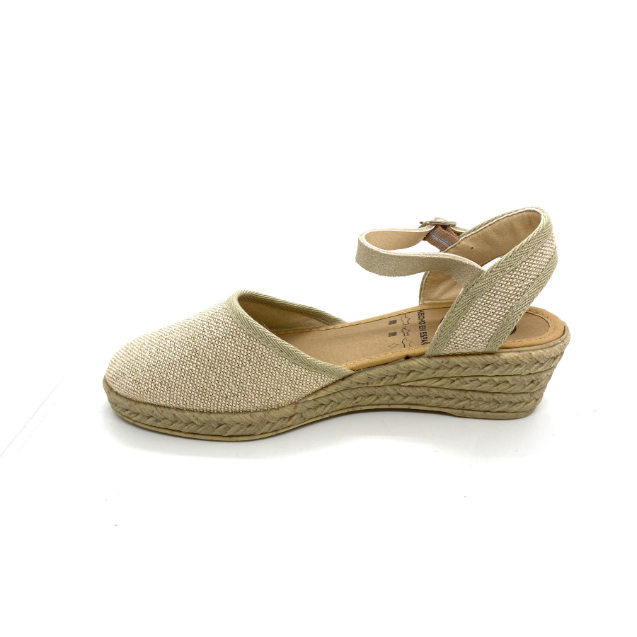 Zapatilla tipo Valenciana fabricada en material textil con suela imitando al cáñamo y ajuste de pulserilla.