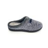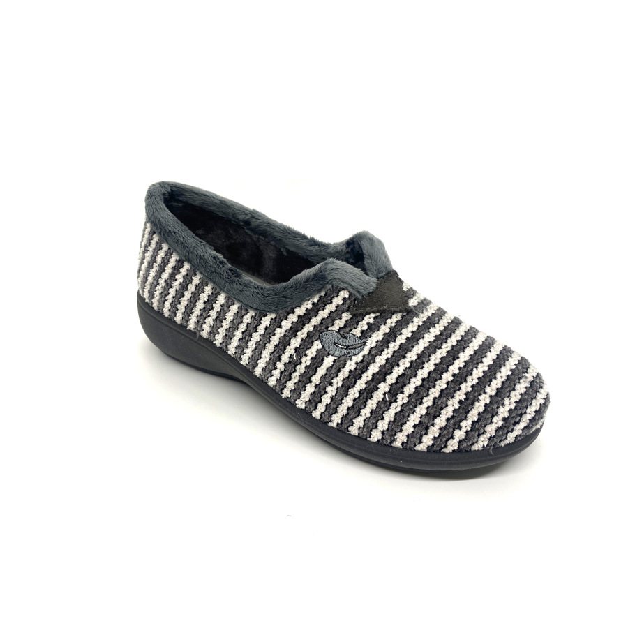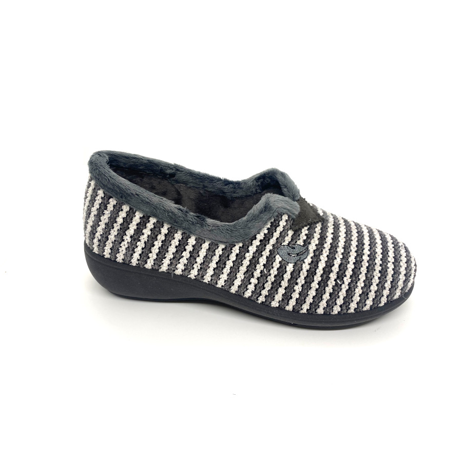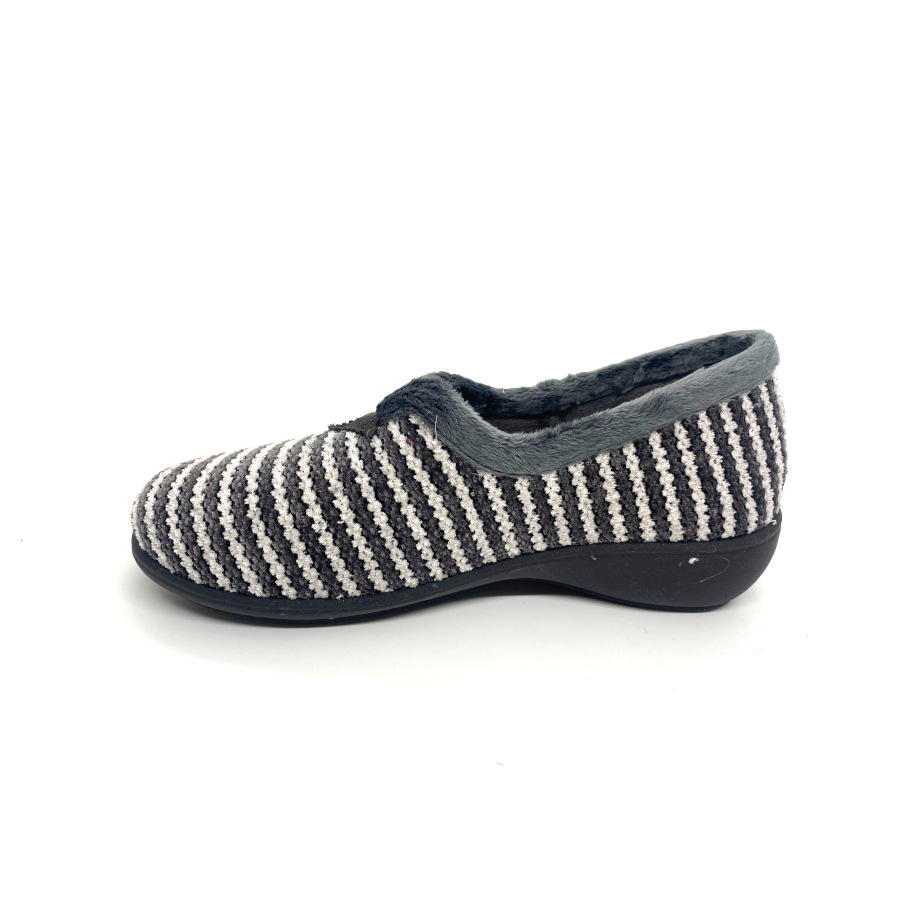 Zapatilla cerrada con cuña con diseño de rayas grises y blancas para señora con plantilla extraible y PLUMAFLEX de la marca ROAL. Máximo confort para estar en casa.