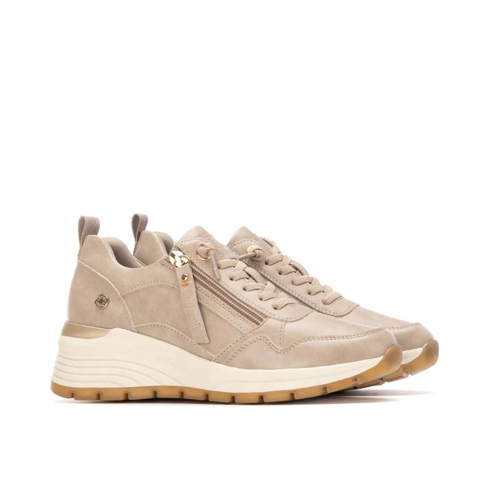 Zapatilla de mujer, de la marca Refresh. Fabricada en material que imita a la piel. Cierre mediante cremallera en el lateral. Cordones elásticos al tono. Tirador trasero para facilitar la puesta. Con plantilla extraíble. Este modelo ha obtenido el certificado vegano por la organización mundial PETA (Organización de los derechos de los animales).