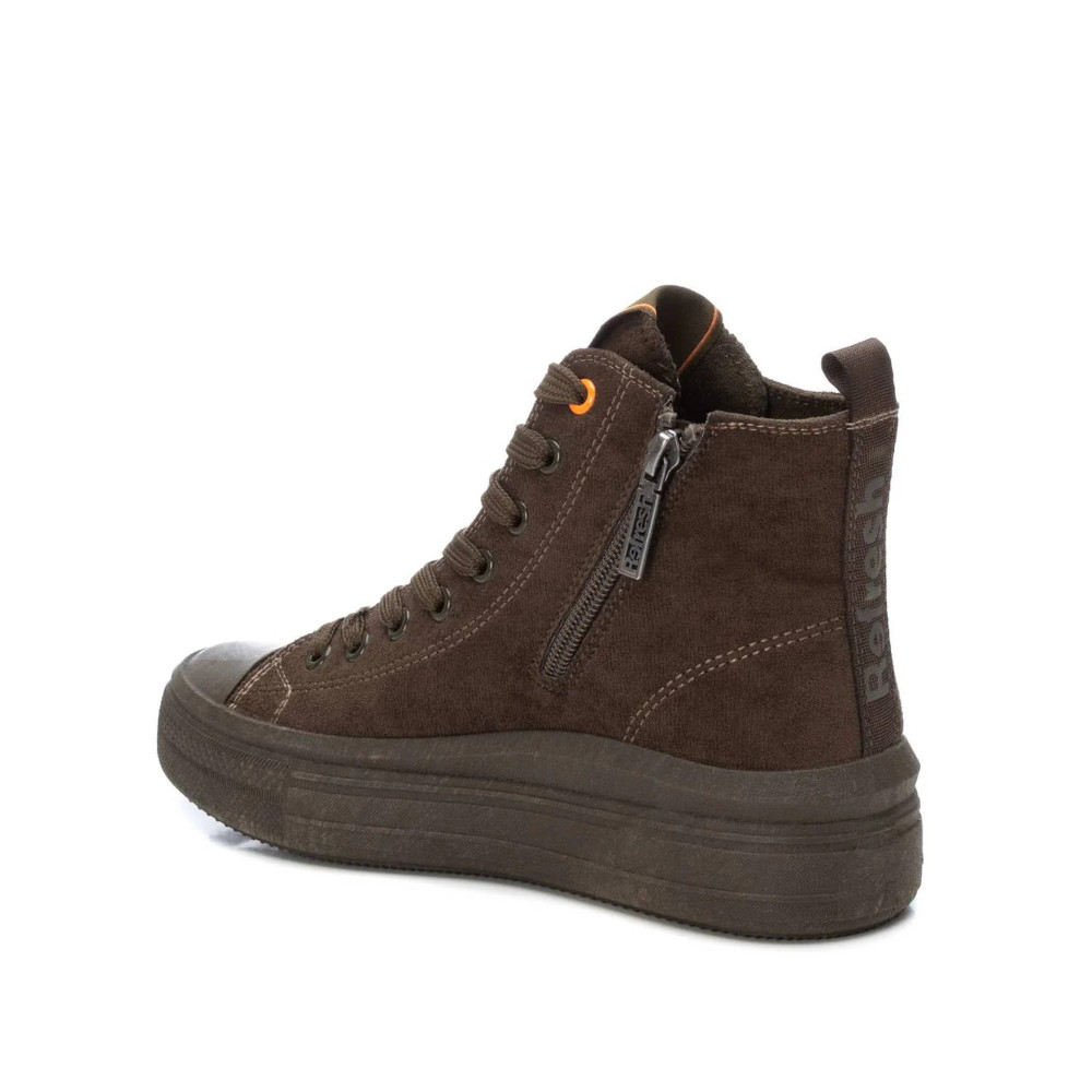 Botín de mujer, de la marca Refresh. Fabricada en antelina. Cierre mediante cremallera interior. Cordones regulables al tono. Un básico que no puede faltar en tu armario esta temporada. Con cómoda suela de goma antideslizante. Este modelo ha obtenido el certificado vegano por la organización mundial PETA (Organización de los derechos de los animales).