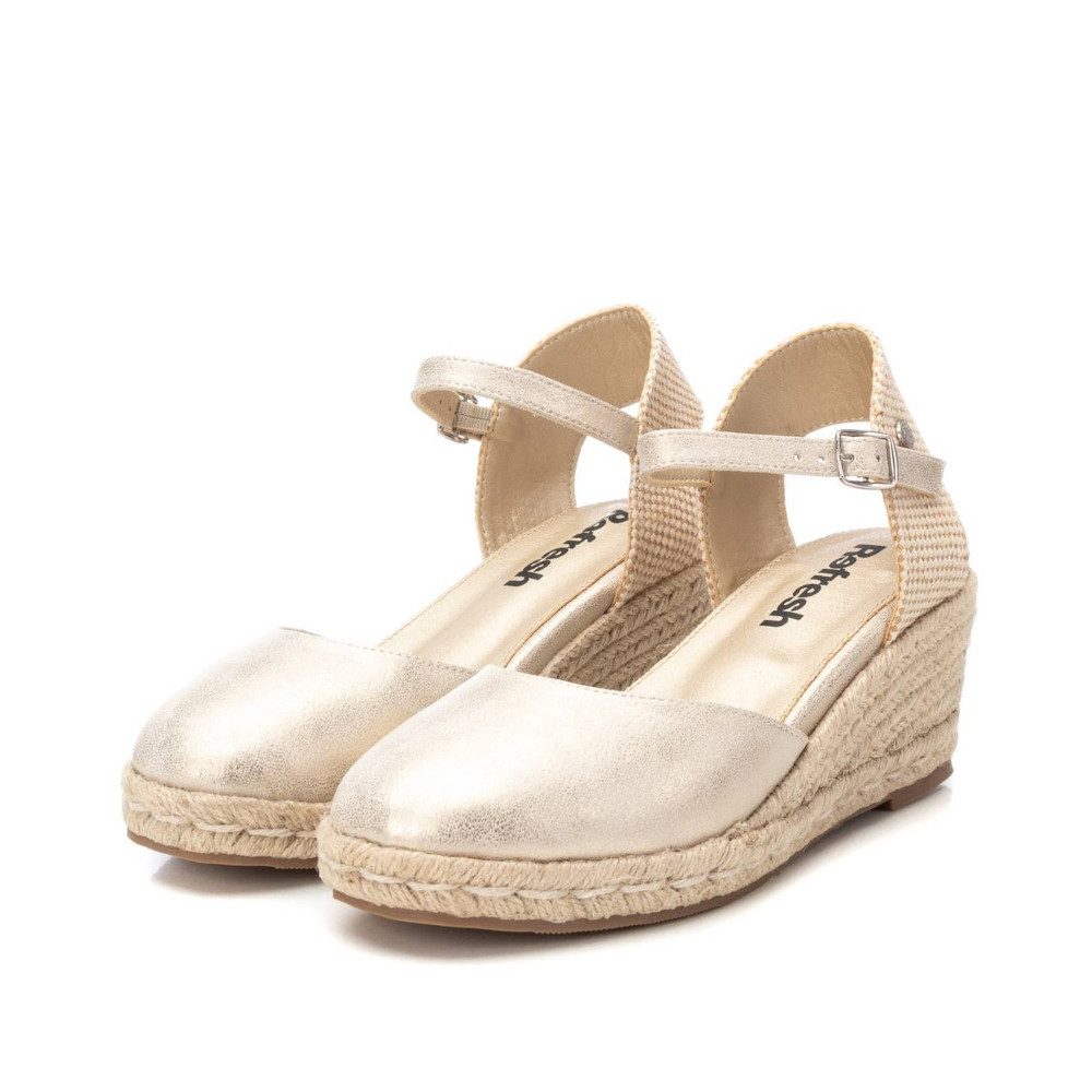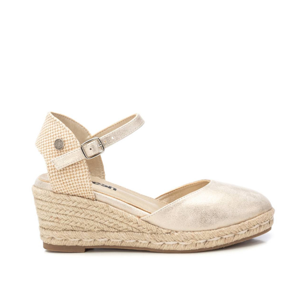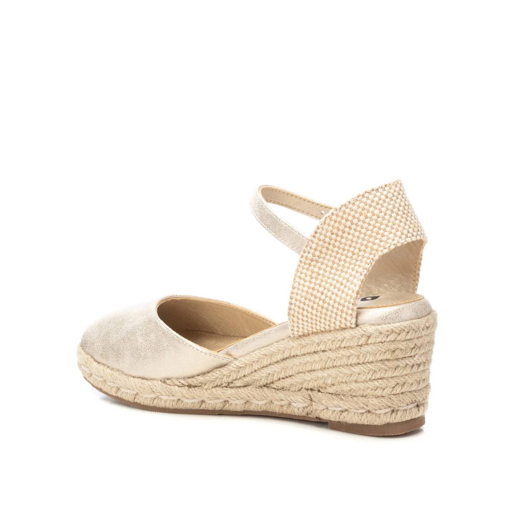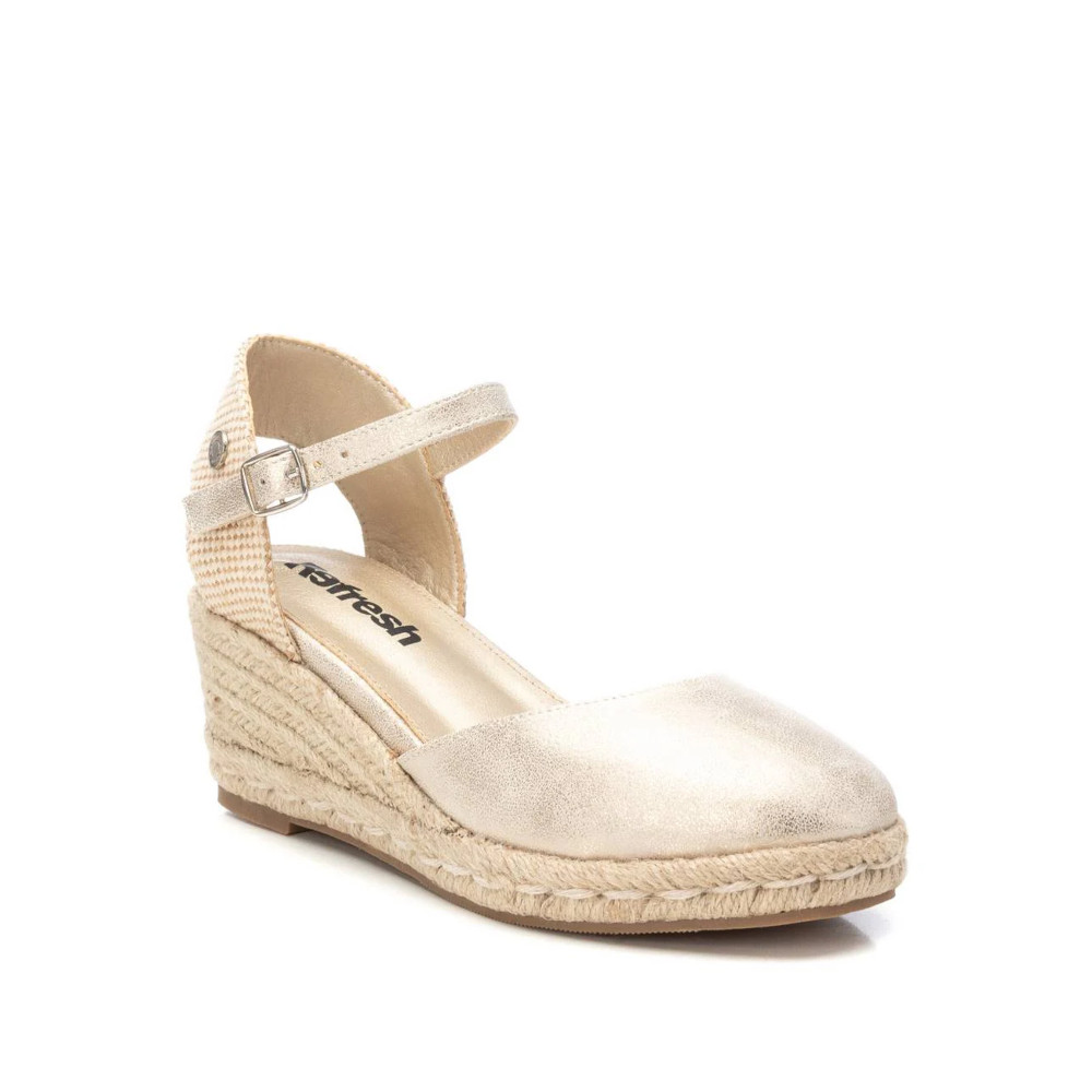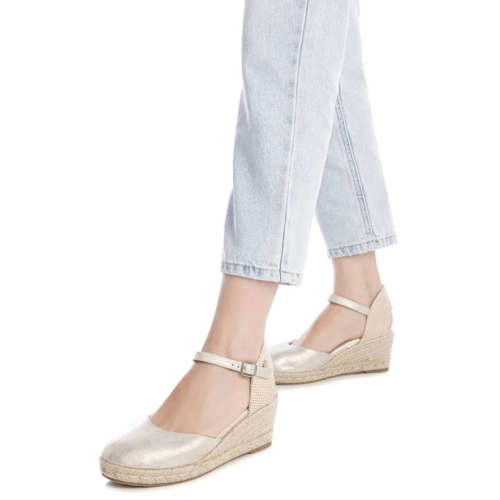 Alpargata tipo valenciana de mujer, de la marca Refresh. Fabricada en material que imita la piel con efecto metalizado. Pulsera al tobillo con hebilla. Cuña de 5cm de yute y suela de goma antideslizante. Este modelo ha obtenido el certificado vegano por la organización mundial PETA (Organización de los derechos de los animales).
