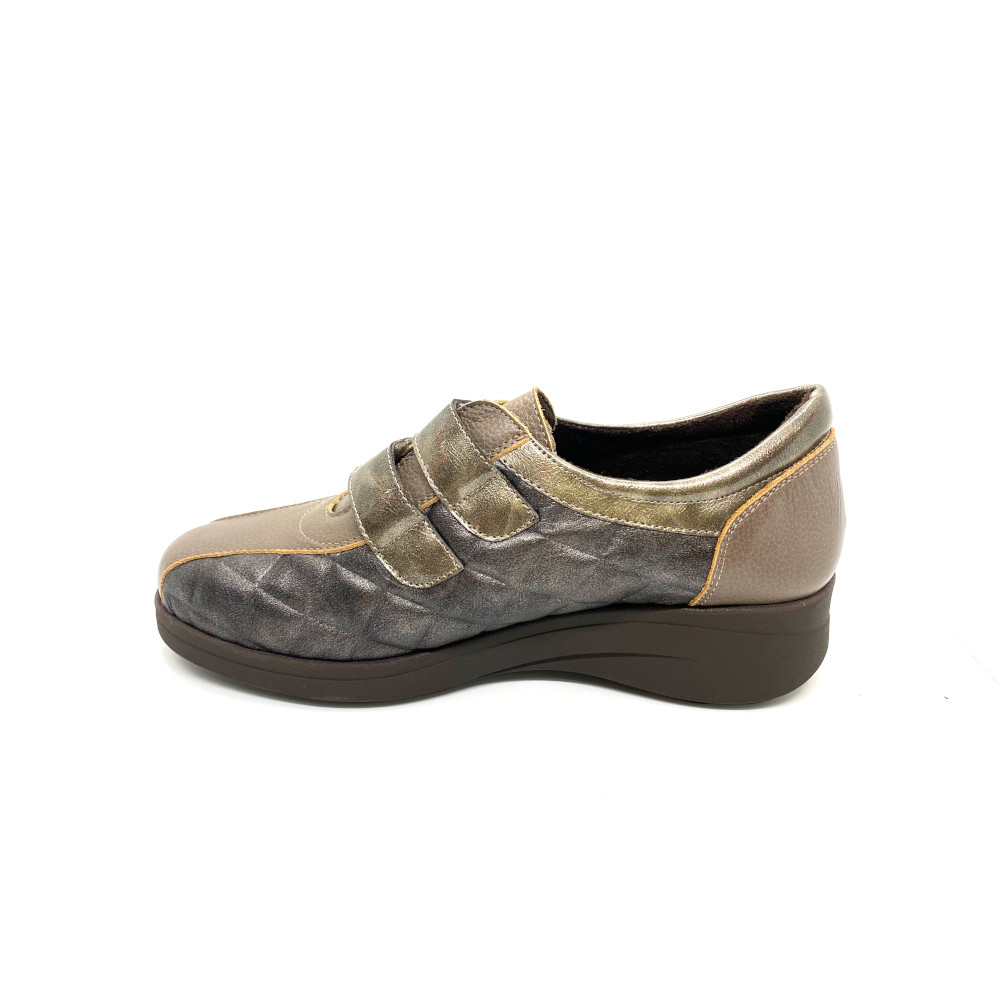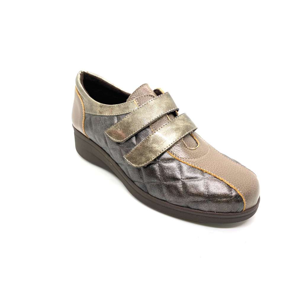 Zapato de señora fabricado en pieles de primera calidad combinado con materiales elásticos para un mejor confort y ajuste de velcro.